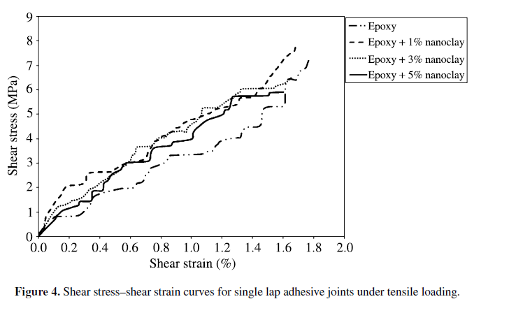 اتصالات چسبی که با لایههای کامپوزیت اپوکسی/نانوکلی تهیه شده بودند، برای آزمایش استحکام برشی لایهای (LSS) در کشش تست شدند. اتصالات تهیه شده با مقادیر مختلف ذرات نانوکلی برای ایجاد یک مقایسه آزمایش شدند. استحکام چسب به طور عمده به دو پارامتر بستگی دارد: